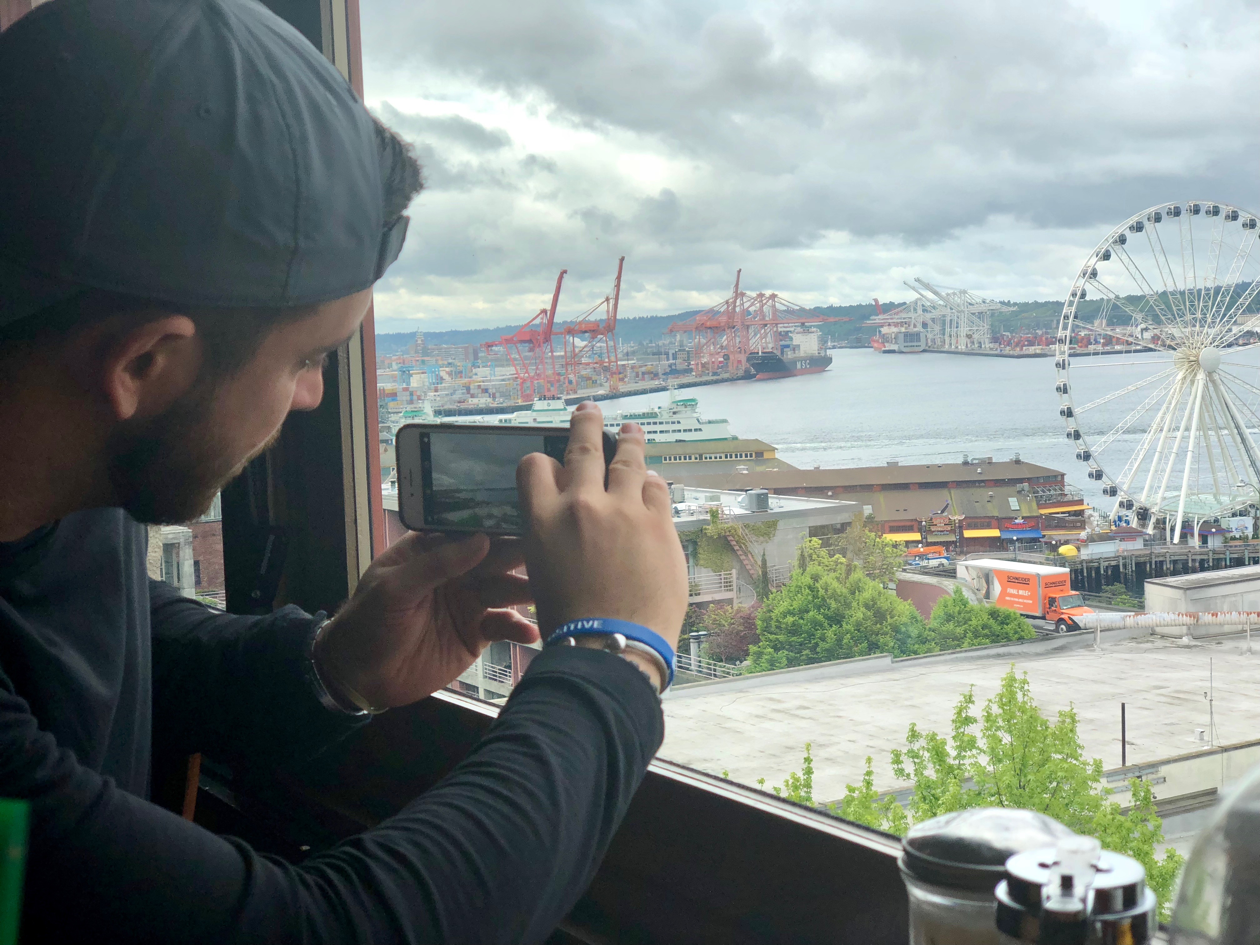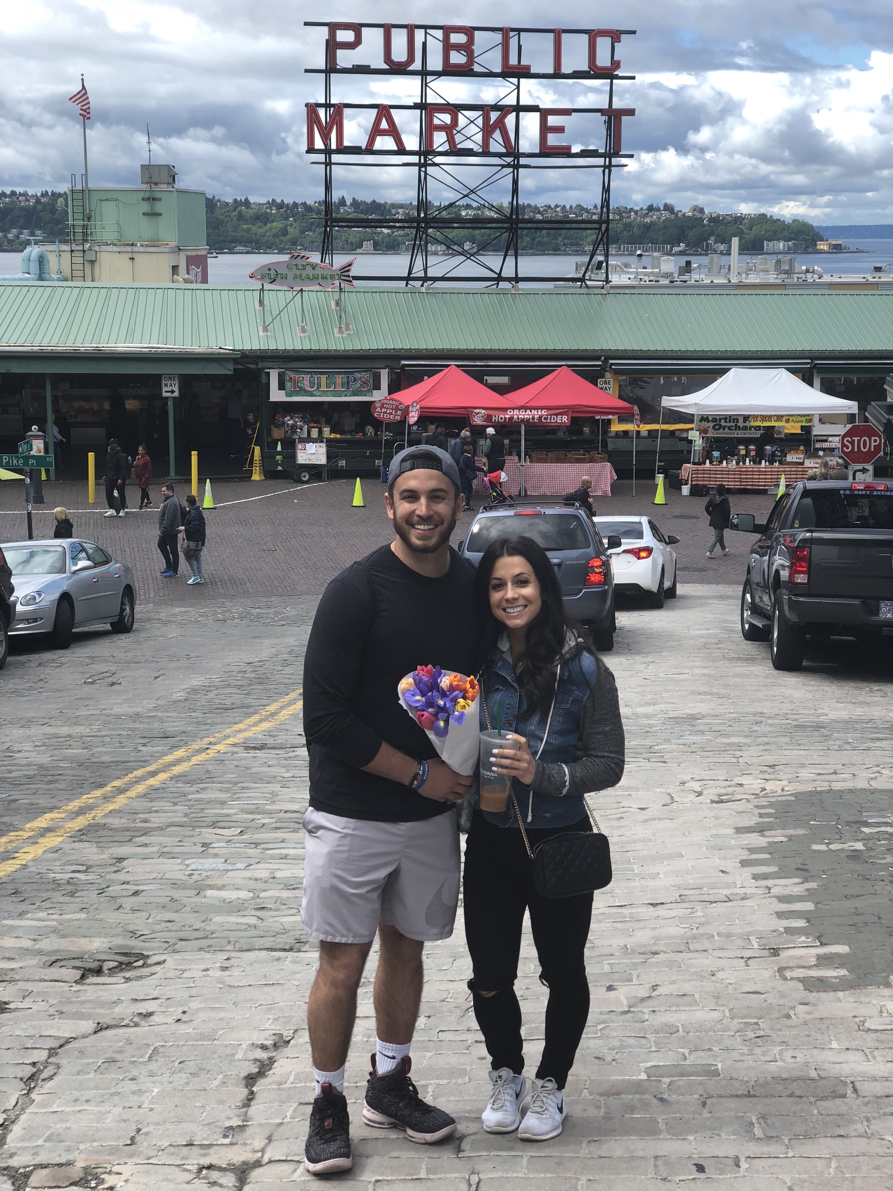 We landed around 6:00 P.M. and took the public transportation system from the airport to downtown and then an uber to our place. The tram was $2.75 a person and the uber was like $5 bucks or so, super cheap! Our Air BnB was about a 7 minute walk from Pike Place Market so we walked in that direction once we arrived, but I wouldn’t go see it because I didn’t want to ruin the morning surprise haha. We roamed, got some food and then headed to bed so we were well rested for the next three days! Some added bonuses to the days ahead—my cousin and his friend were in town and so was Gabe’s high school friend and her boyfriend! We met up at different times throughout the trip and formed a cute little Seattle family if I do say so myself!